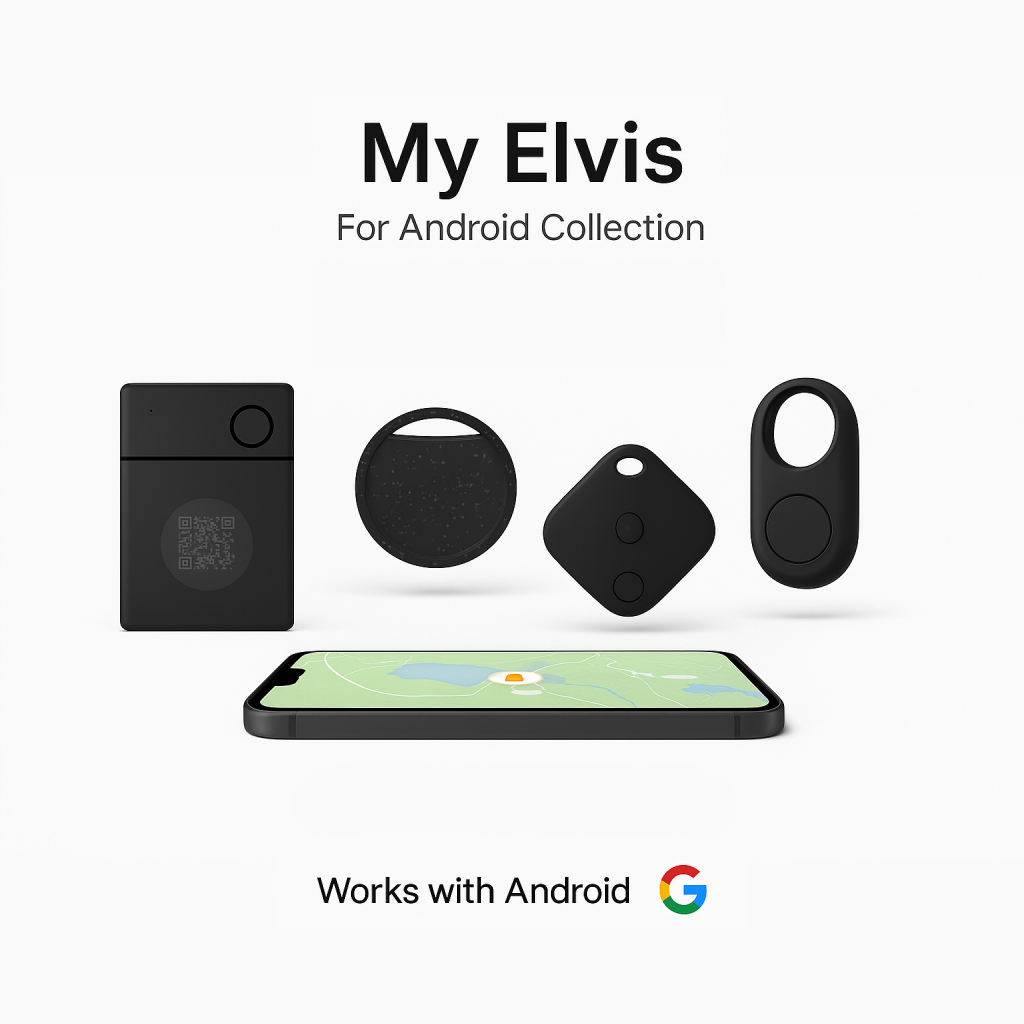 MyElvis Android Collection: global tracking for keys, wallets, bags & pets. Official Google Find My tech, premium design.